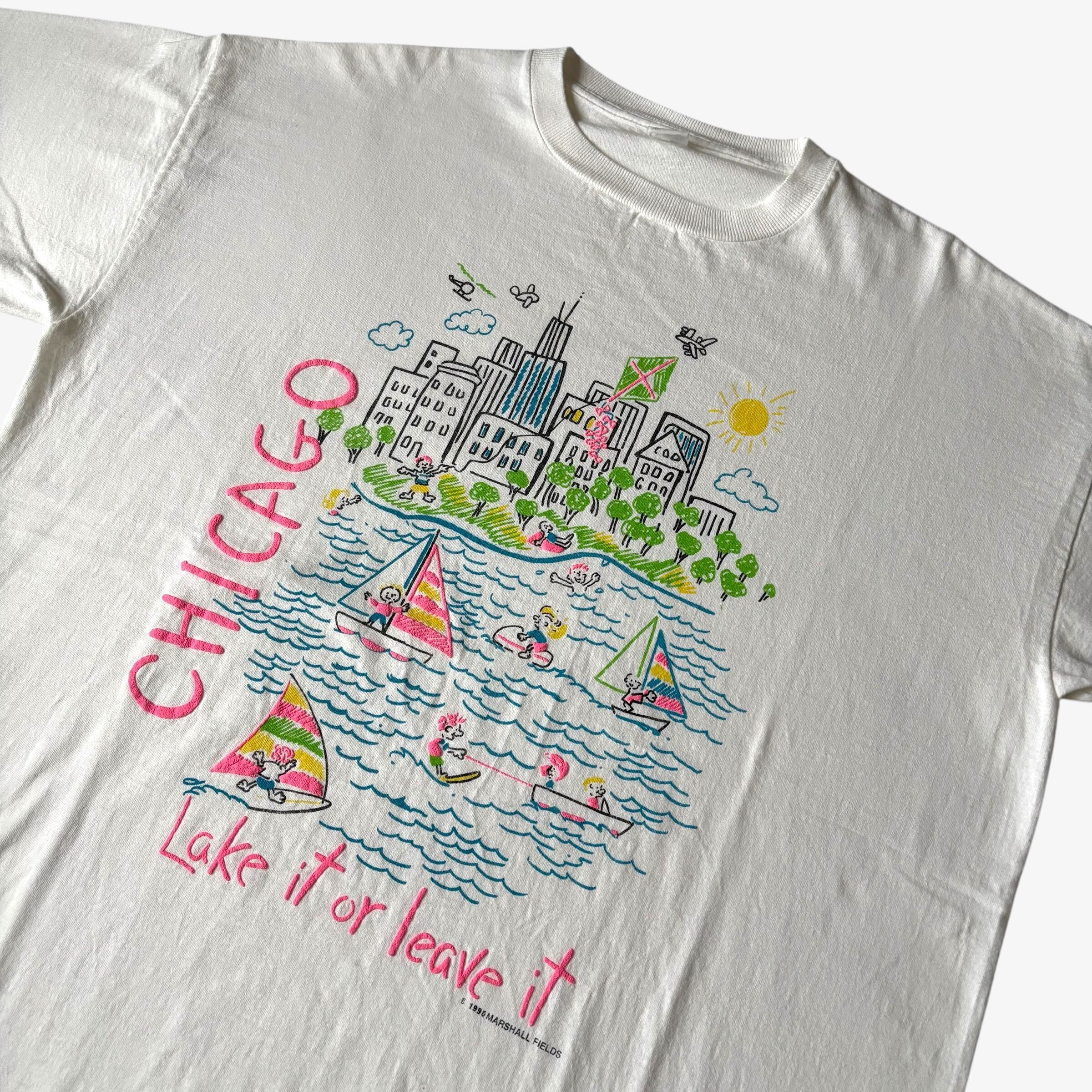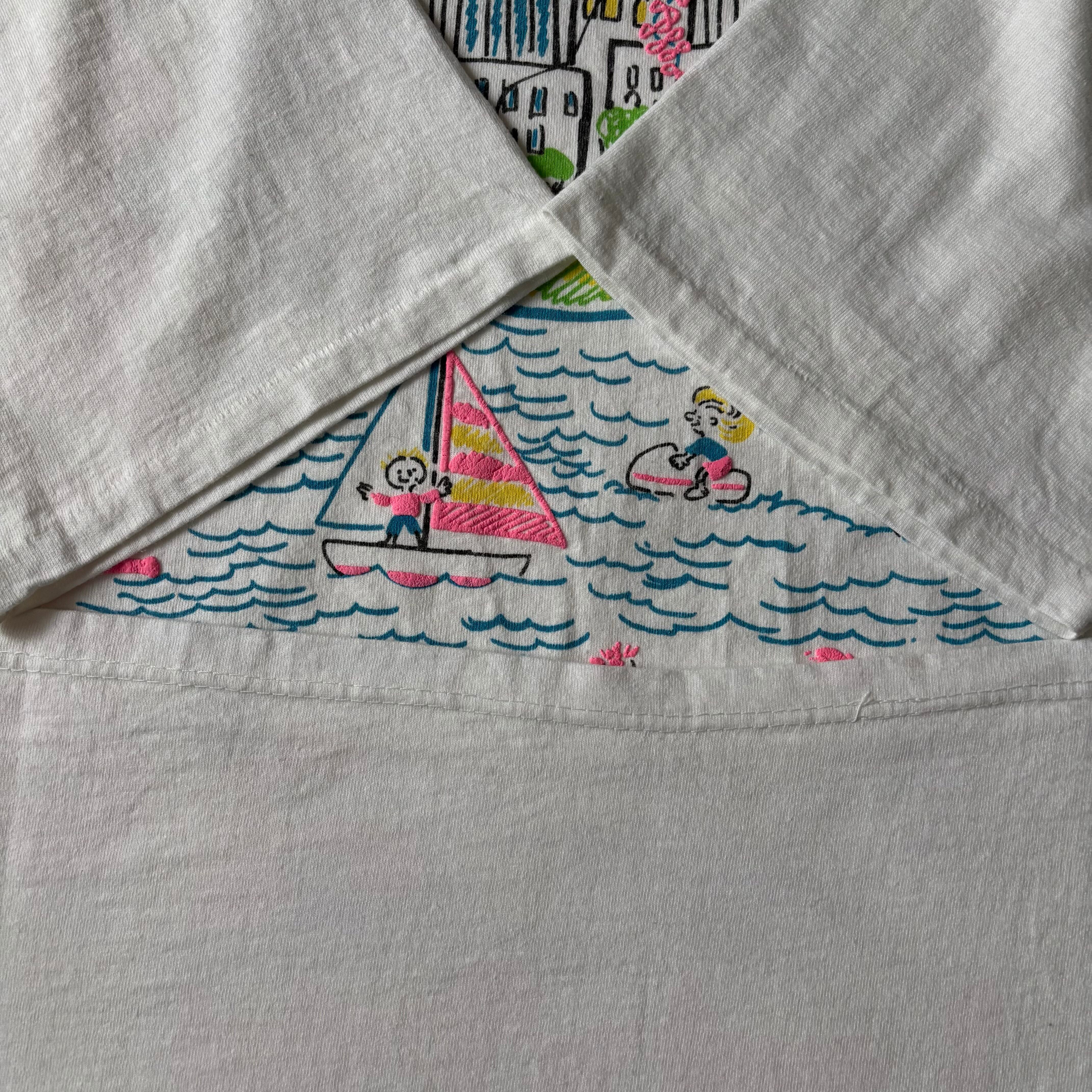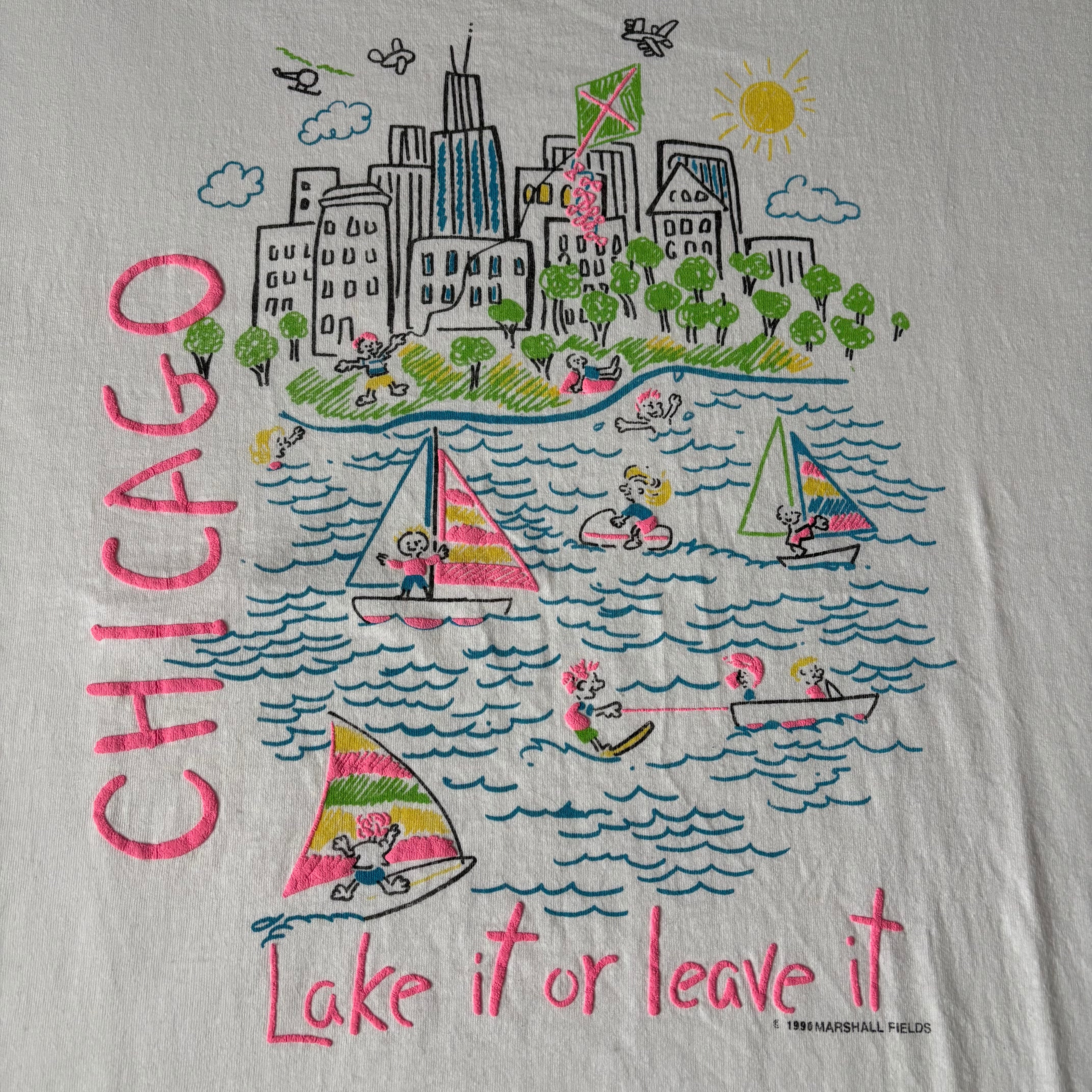 タグ擦れちゃってますが、90sコピーライト入りのUSA製かなと思います。シカゴをテーマに愉快に遊んでるプリント、カラーがものすごく良いです。