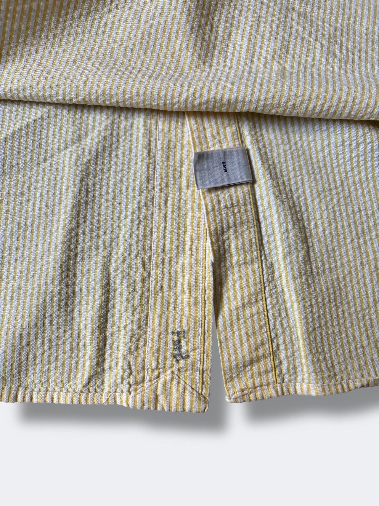 首元のボタン1個なし、裏面生地に印字あり。