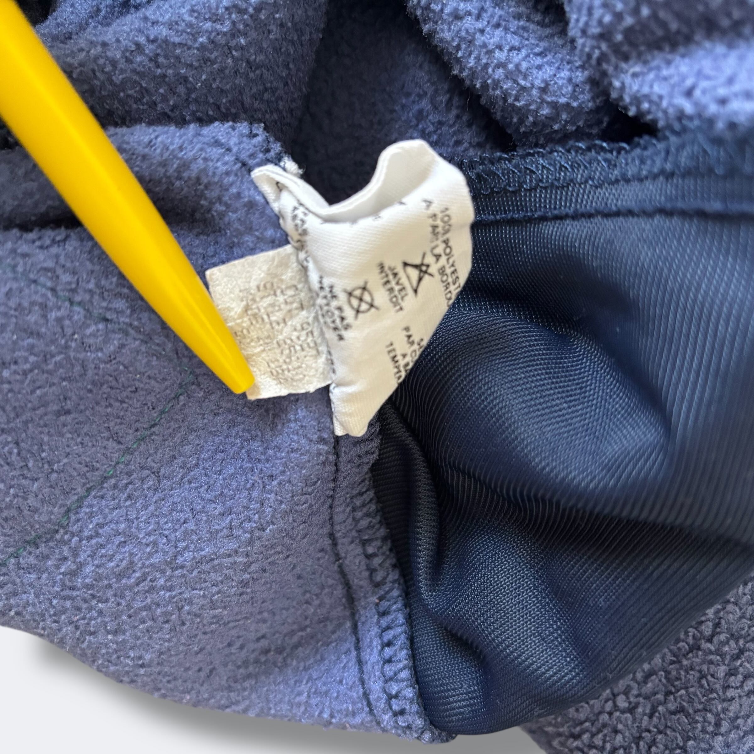 フロントのウッド調ボタンと胸元のロゴ刺繍がポイント。裏地に配されたターコイズカラーがアクセントとなり、90年代らしい雰囲気あり。
