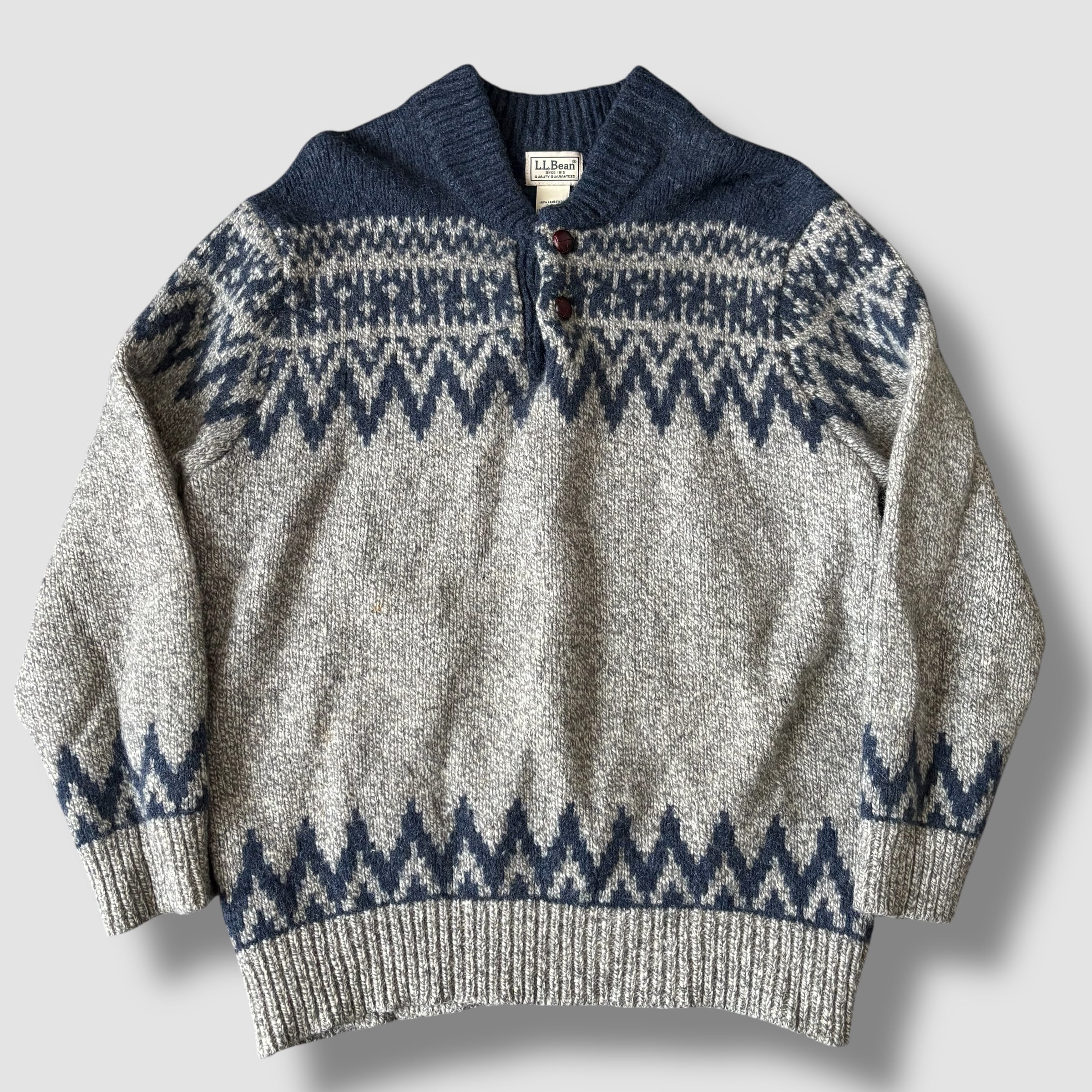 上質な 100%ラムウール を使用しており、厚みのあるしっかりとした生地感で、保温性抜群です。ネイビーとグレーの落ち着いたカラーリングに、伝統的なフェアアイル調の模様が映える一枚。ショールカラーとウッド調ボタンがアクセントになっており、冬のカジュアルスタイルにぴったりです。エルエルビーンの人気のニットセーターです。