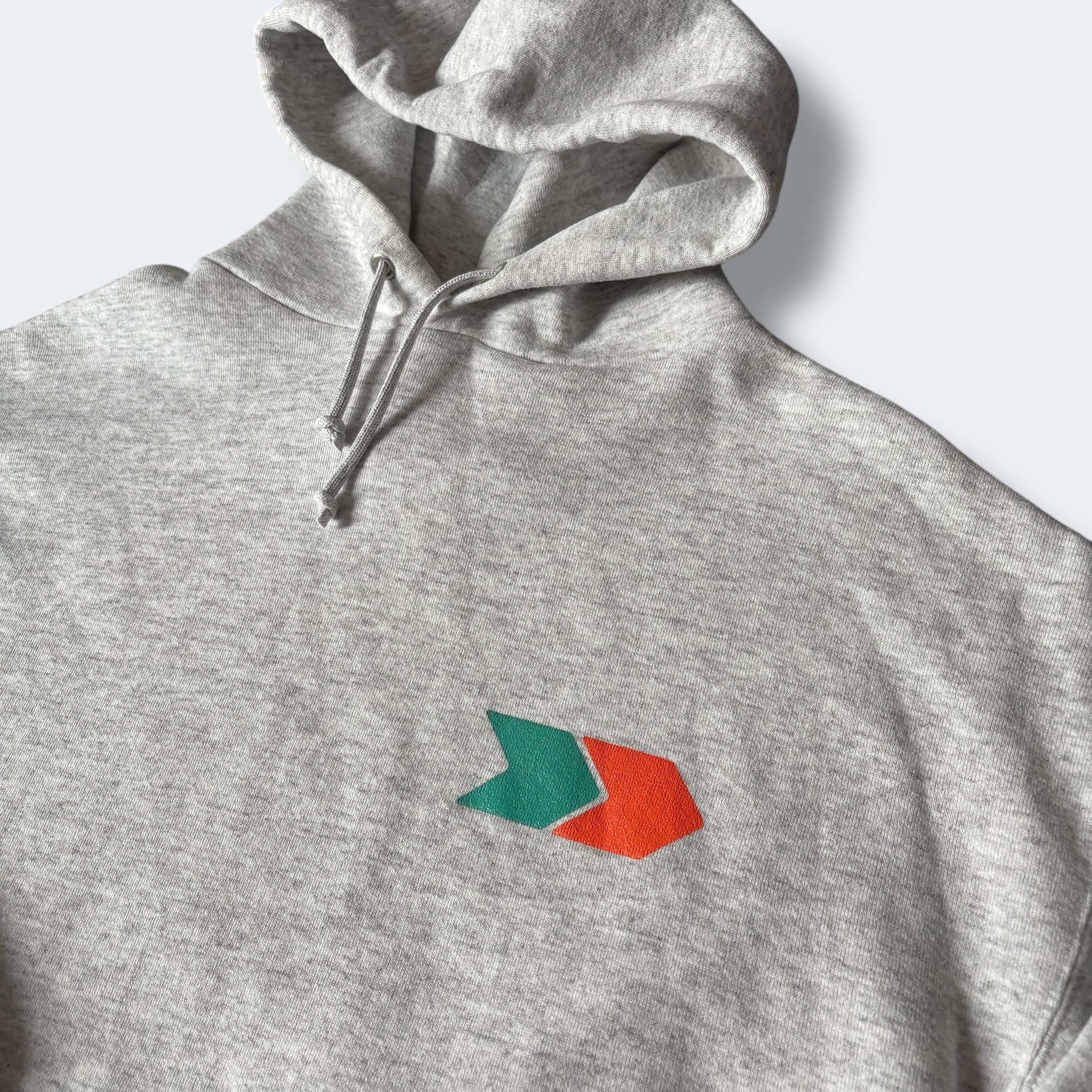 しっかりとした生地感のヘビーウェイトボディに、胸元にはグリーンとオレンジの幾何学ロゴプリントが施されたミニマルなデザイン。