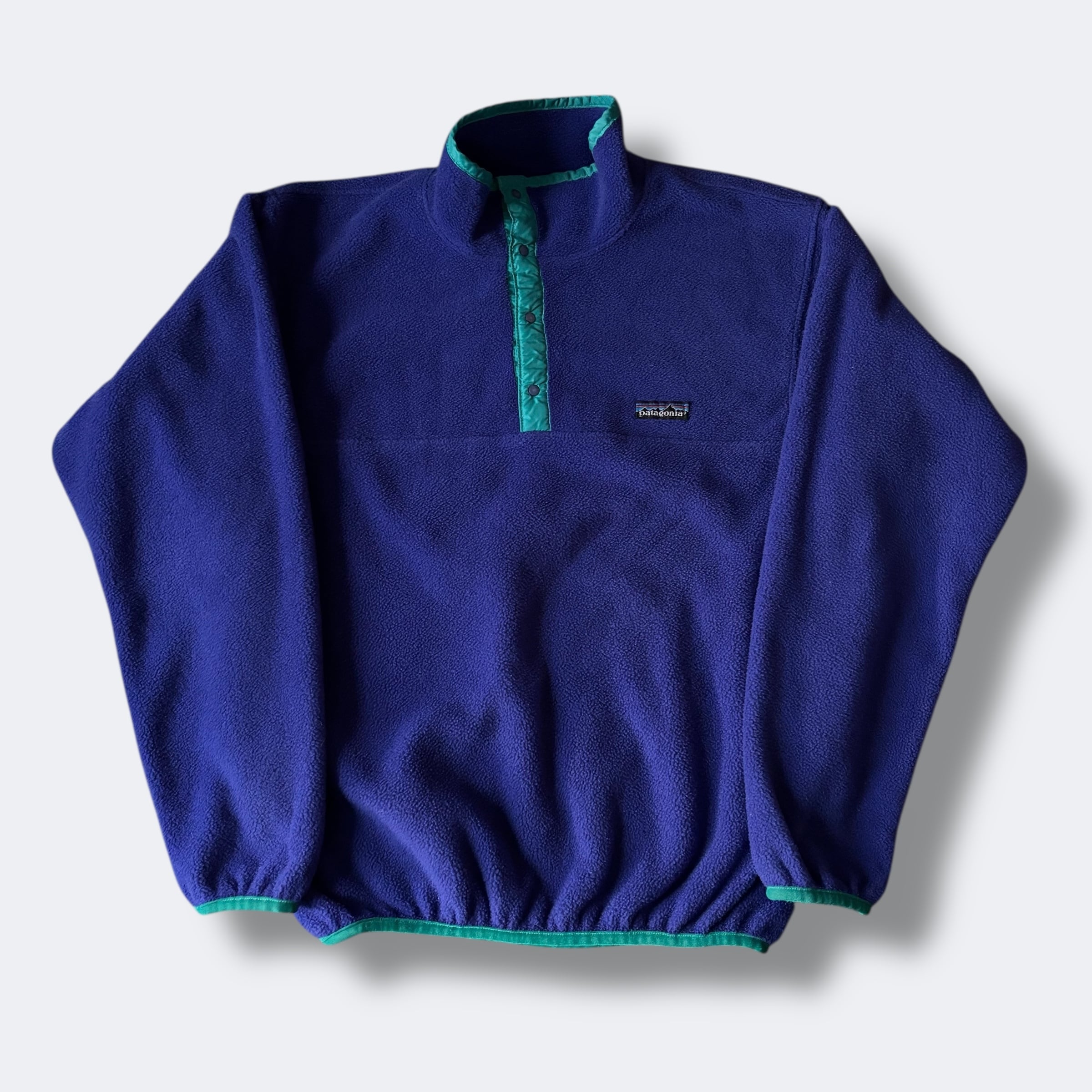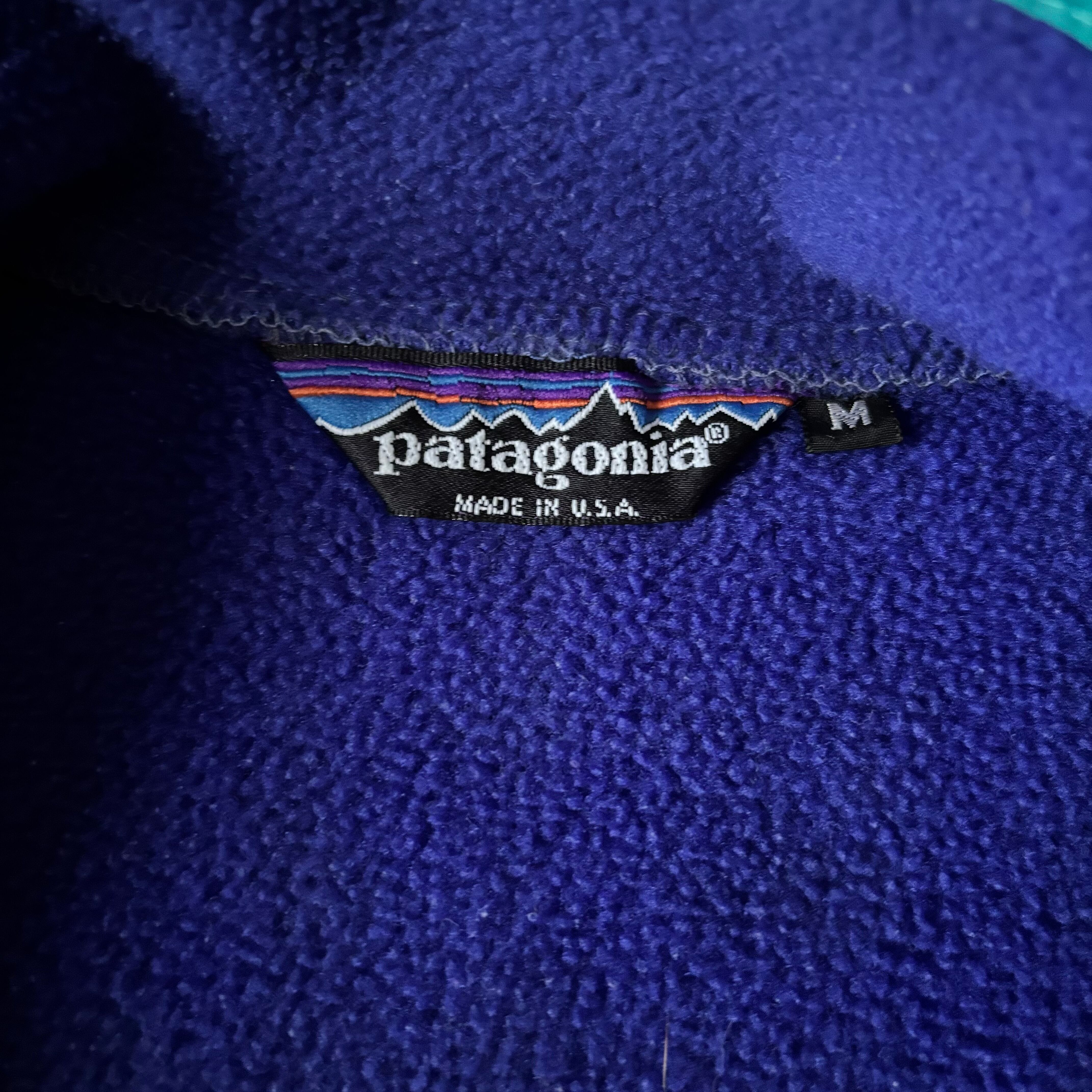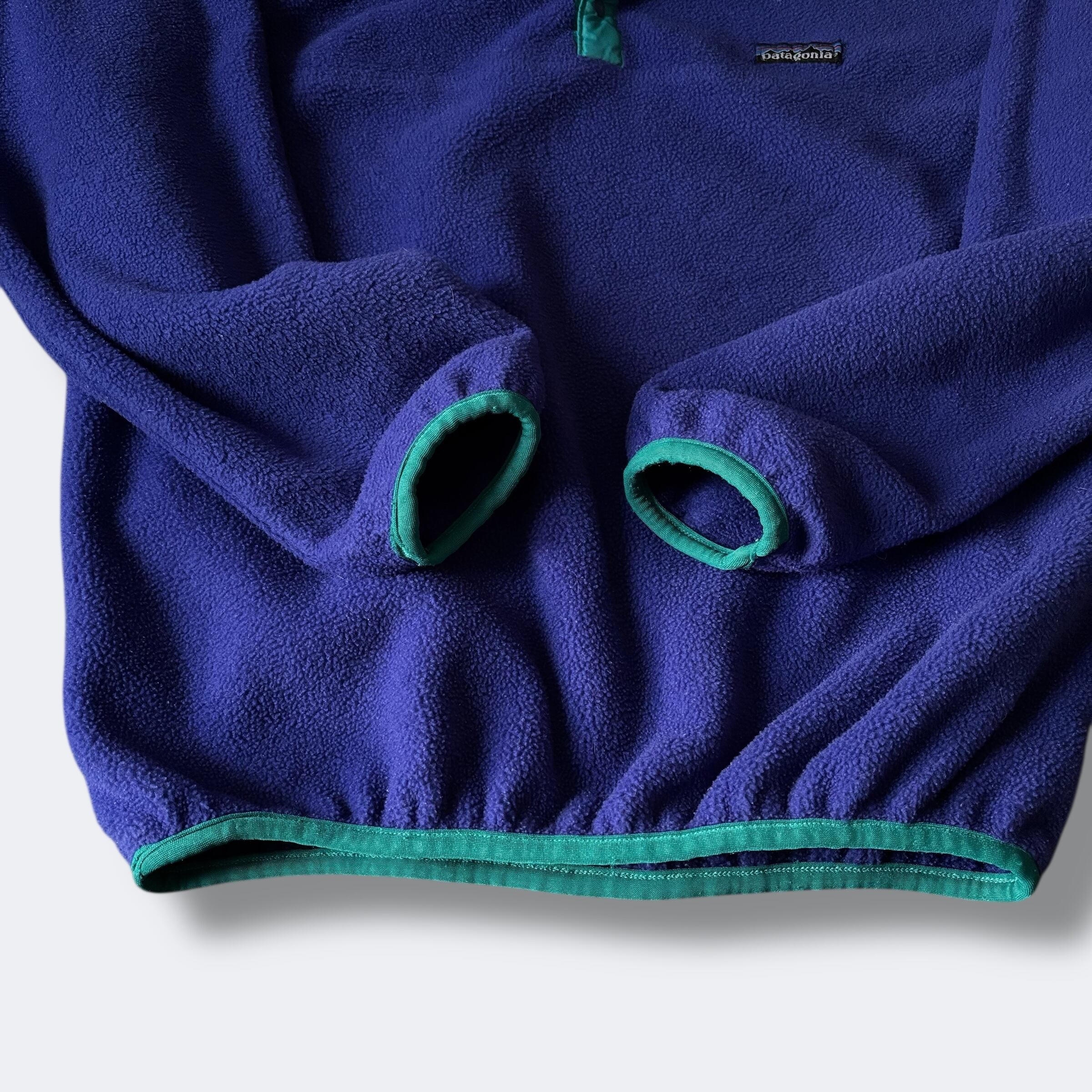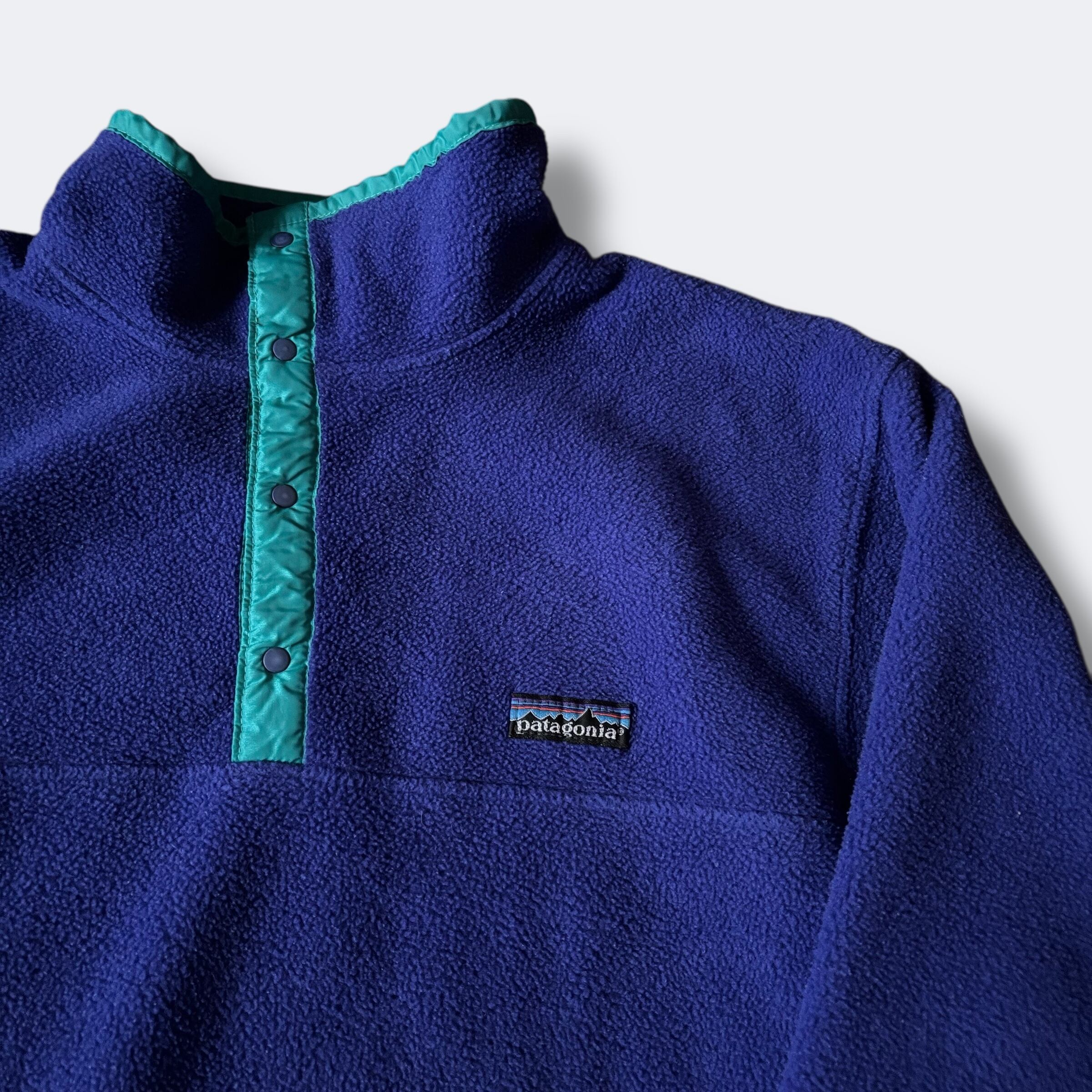 ボディカラーはヴィンテージパタゴニアでも人気の高い コバルトブルー×エメラルドグリーン。当時のコレクション価値の高い一着です。
